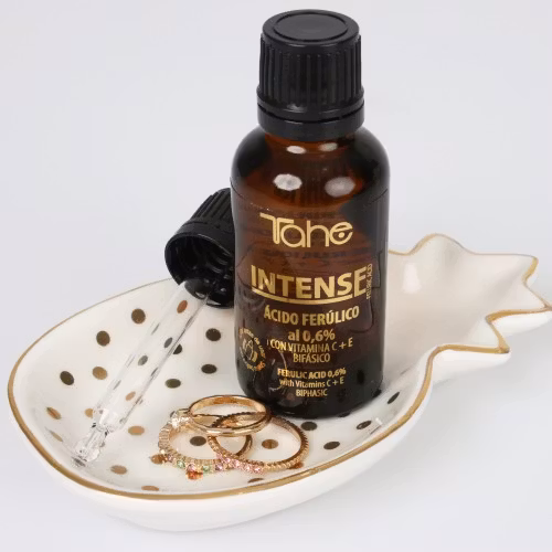 En kraftfull kombination av antioxidanter från en bas av ferulsyra och vitamin C och E, som bidrar till och förstärker hudens fotoskydd mot UVA- och UVB-strålar från solen genom att öka dess försvar och genom att neutralisera och bekämpa skador orsakade av yttre faktorer i miljön såsom föroreningar som är ansvariga för för tidigt åldrande av huden.