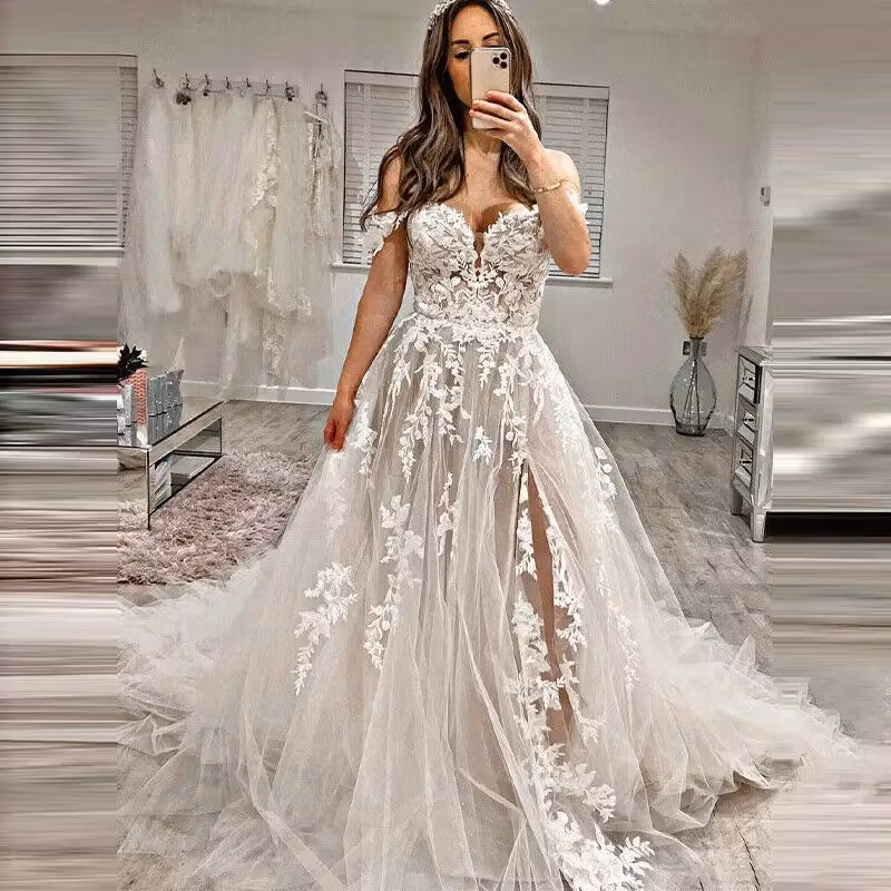 A Line Eleganta Boho Bröllopsklänningar Off The Shoulder V-ringad Spetsapplikationer Designer Brudbröllops klänningar