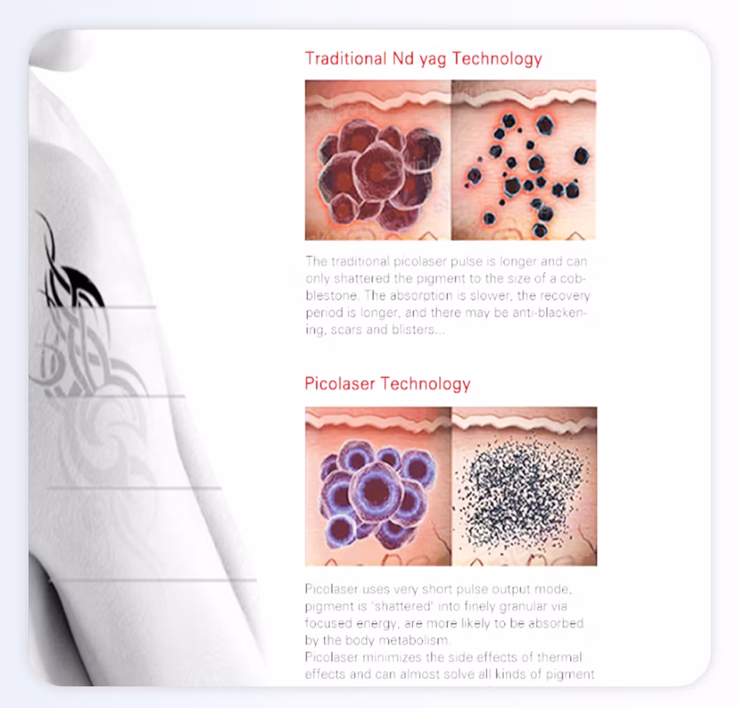 Genom att använda den explosiva effekten av Nd: YAG-lasern tränger lasern igenom epidermis in i dermis, vilket inkluderar mängden pigmentmassa. Eftersom lasern pulserar på nanosekunder men med superhög energi, sväller skottpigmentmassan snabbt och bryts i små bitar, som kommer att elimineras genom metabola systemet.