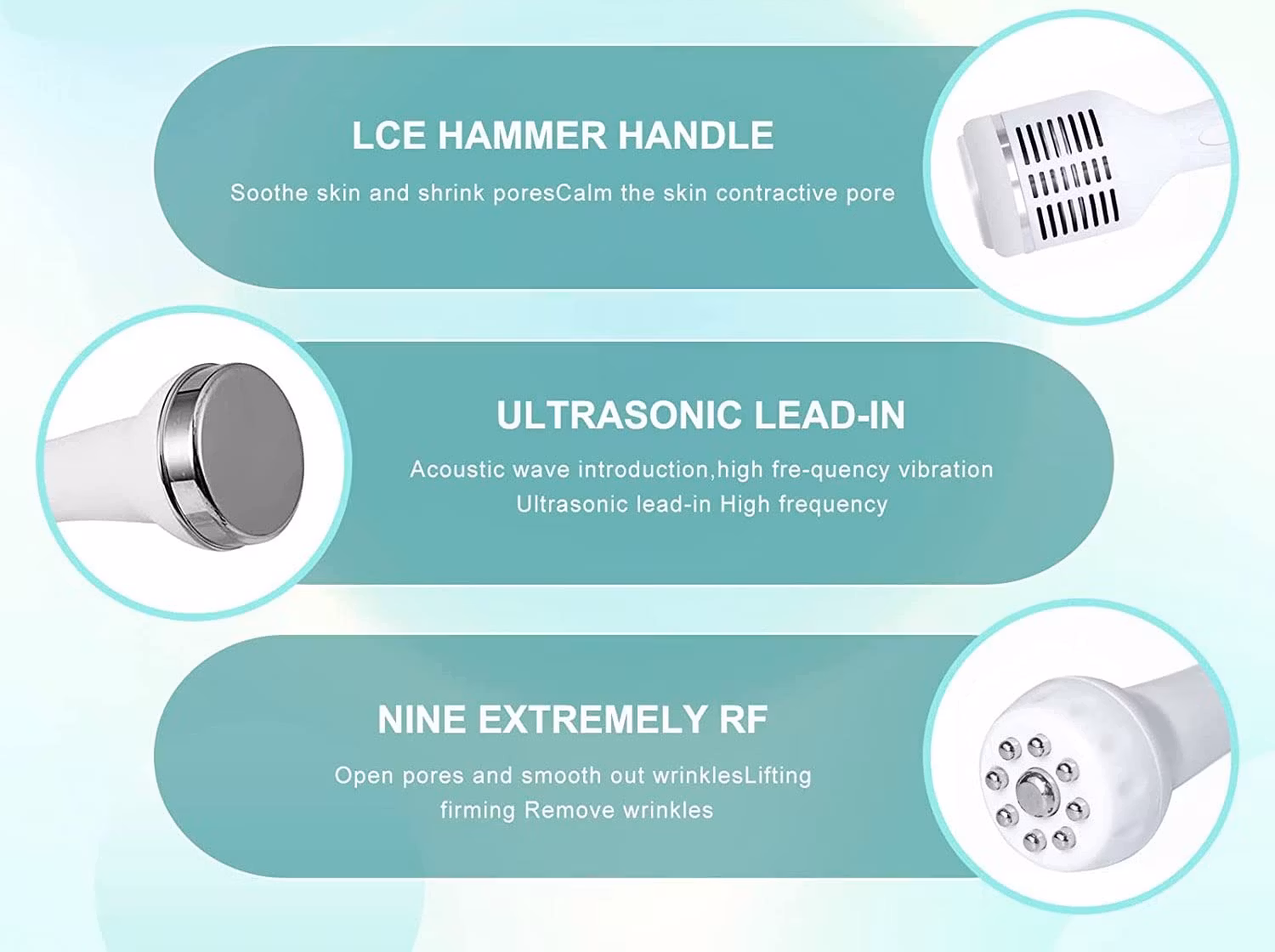·3. Ultraljud: Genom 1 miljon till 3 miljoner vibrationer tränger essensen djupt in i huden, masserar försiktigt celler, främjar ämnesomsättningen, ökar cellviabiliteten och förbättrar blod- och lymfcirkulationen;