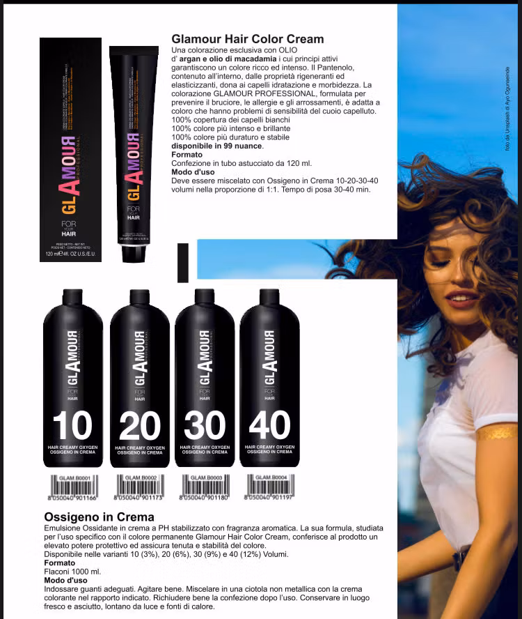 En exklusiv färg med ARGANOLJA och MACADAMIAOLJA vars aktiva ingredienser garanterar en rik och intensiv färg. Panthenol, som finns inuti, med regenererande och elasticerande egenskaper, ger håret återfuktning och mjukhet. GLAMOUR PROFESSIONAL färg, formulerad för att förhindra sveda, allergier och rodnad, är lämplig för dig som har problem med hårbottens känslighet.