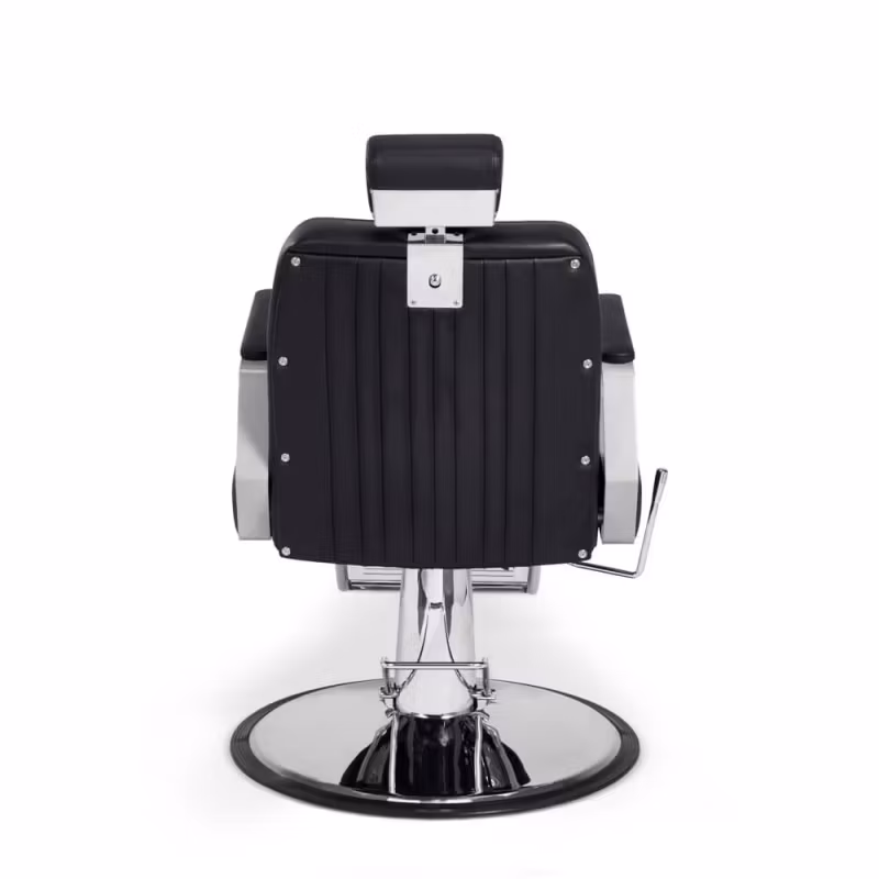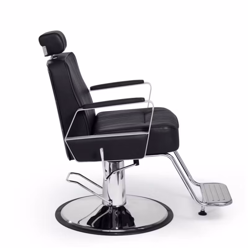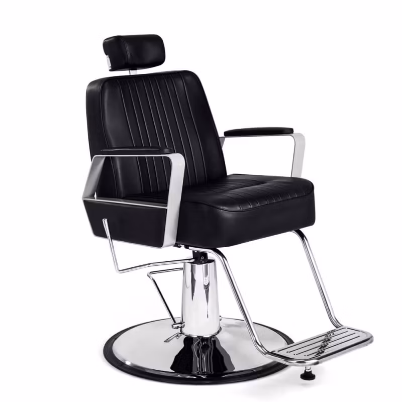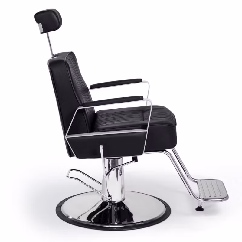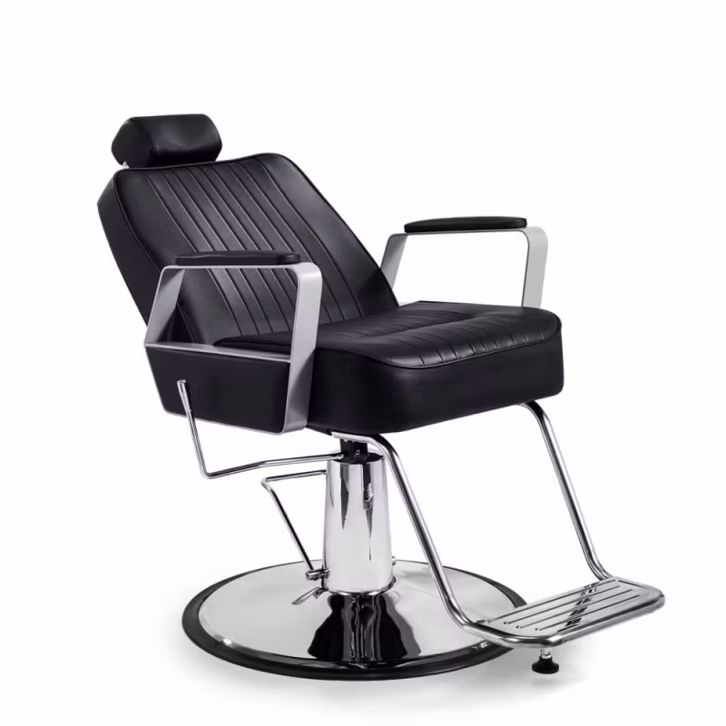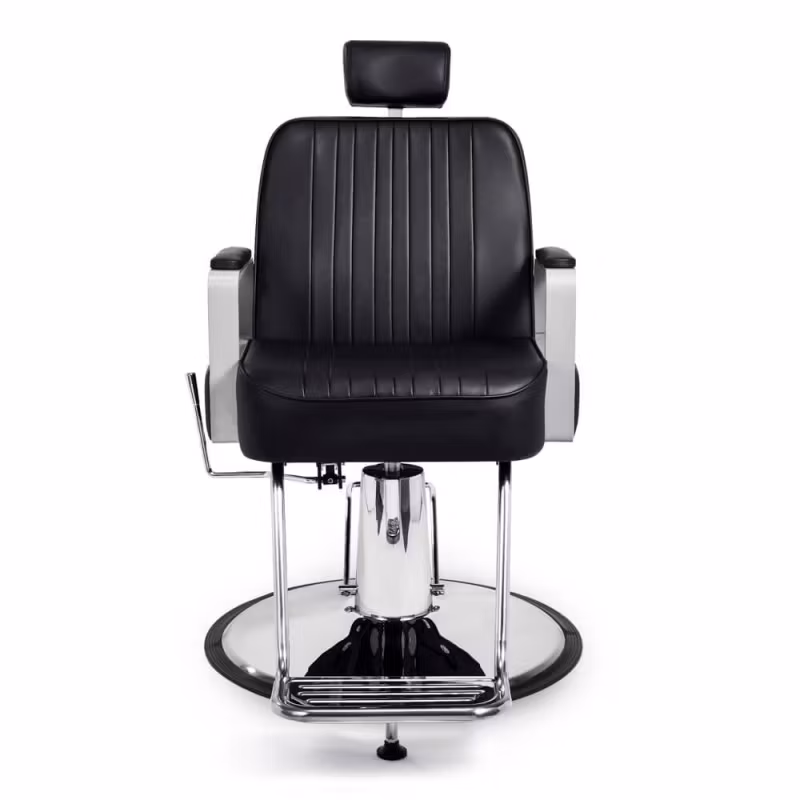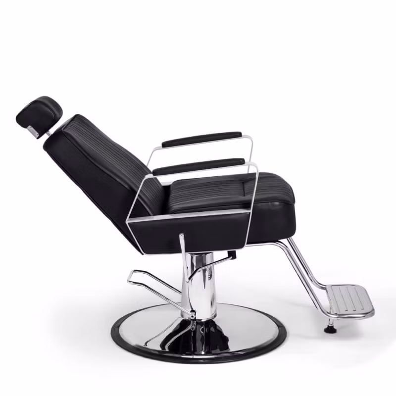 Ekonomisk frisörstol med fällbart ryggstöd. Klädd i högkvalitativt brandskyddande polyläder. Snabb återhämtning av högdensitetsskum. Höjdjusterbar hydraulpump.