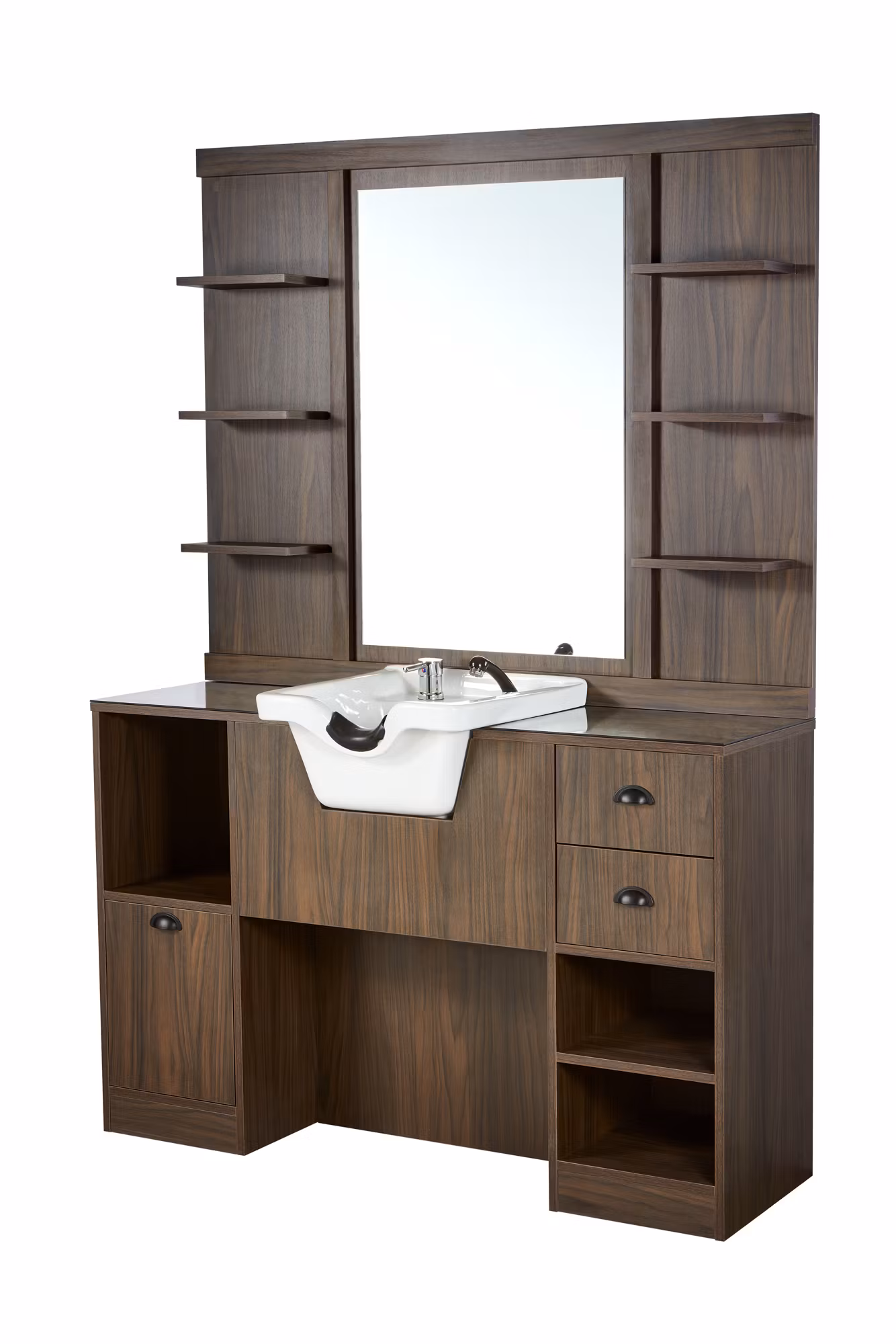 Modulär frisörstylingenhet i mörk eller ljus trämelamin som låter dig bygga en skräddarsydd arbetsyta.